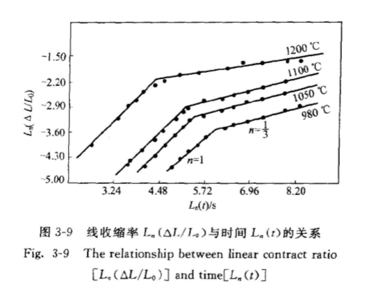 即線收縮率△L/La正比于時(shí)間t。根據(jù)普通粉體以擴(kuò)散傳質(zhì)為主的固相燒結(jié)模型,初期燒結(jié)的動(dòng)力學(xué)關(guān)系為△L/ L=kt對(duì)于不同的擴(kuò)散傳質(zhì)機(jī)理,式中指數(shù)n取值在2.5~5之間變化。