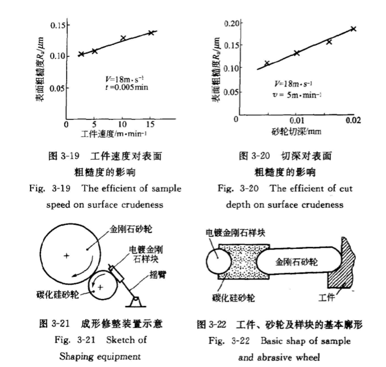 精密時參數(shù):工件速度3~5mmin-1,砂輪切深O0.005~0.010mm,砂輪速度為18ms1。這樣,試件的表面粗糙度R值可控制在0.16pm以內(nèi)。成形磨削用樹脂結(jié)合劑金剛石砂輪。