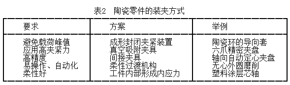 表2 列出陶瓷材料的幾種裝夾方式。陶瓷工件在裝夾過(guò)程中要保證工件的夾緊力均勻一致,避免產(chǎn)生應(yīng)力突變點(diǎn),從而引起因裝夾而產(chǎn)生的工件損傷。特別是對(duì)于薄壁類(lèi)工件,更需要設(shè)計(jì)專(zhuān)用的夾具,以保證工件的磨削加工。因?yàn)樘沾晒ぜ粚?dǎo)電,不能直接應(yīng)用在電磁吸盤(pán)工作臺(tái),需要借助臺(tái)鉗夾持工件。對(duì)于批量磨削平面零件,就需要設(shè)計(jì)專(zhuān)用的夾具,以提高加工效率。