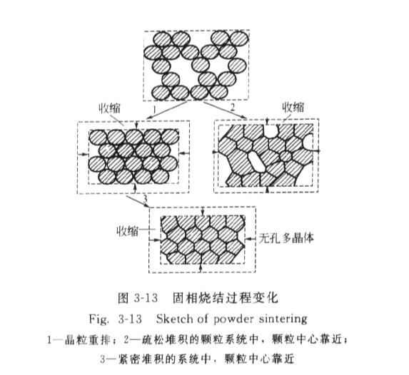 氧化鋯陶瓷制品在固相燒結(jié)過程中,會(huì)發(fā)生許多變化,圖3-13表示了固相燒結(jié)過程變化情況。在這些變化中,最主要的有: