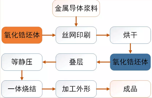 導電漿料可由8-20份金粉、30-60份鎳粉、20-30份鎢粉及8-20份硼硅玻璃粉組成(份數按重量計)。氧化鋯坯體采用干壓成型或者流延成型工藝制備。